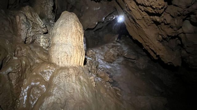Pendant qu’Albert tente une autre approche le reste de l’équipe s’enfile dans la cavité (on se calme là-aussi…). La cavité ne fait que quelques dizaines de mètres de développement mais on prend notre temps. La petite source intérieure est active, l’eau sourd de la paroi concrétionnée et s’écoule sur les petits gours. Seulement 4 petits rhinos sont comptabilisés et une tarente en brumation est blottie dans une anfractuosité.