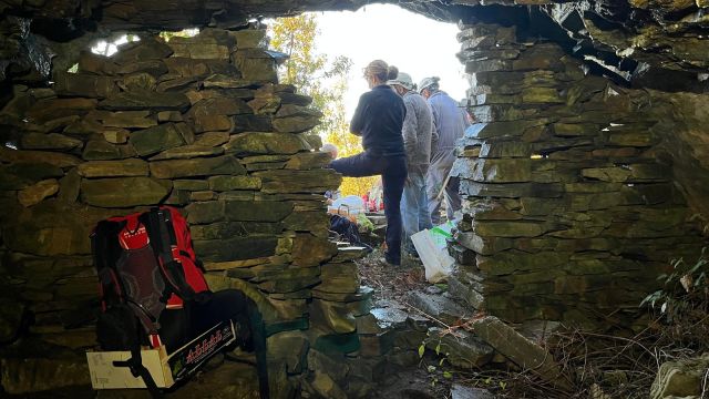 Arrivé au pied du pylône, Franck présente le déroulement de la journée, le parcours. Puis Nono, en bon narrateur, explique le matériel utilisé en spéléo.
