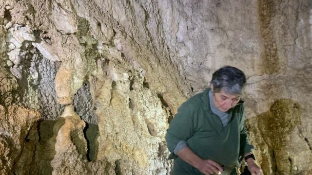 Mais la récolte est pauvre, traditionnelles Meta, un grand rhino endormi, des escargots sûrement issus de l’extérieur et quelques araignées en fond de galerie, probablement une Palliduphantes margaritae. Dominique expertise les bancs rosés de substance molle comme de l’argile contenant de la pyrite. Au fond la galerie est obturée par un bouchon de béton laissant passer un important courant d’air à son sommet légèrement ouvert, l’extérieur ne doit pas être loin.