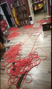 Nous nous attachons à mesurer les nouvelles cordes en 8,5 unicorde (orange) puis les couper dans les longeurs suivantes : 3 cordes 60 m, une corde 50m, une corde 45m, et une 30m.