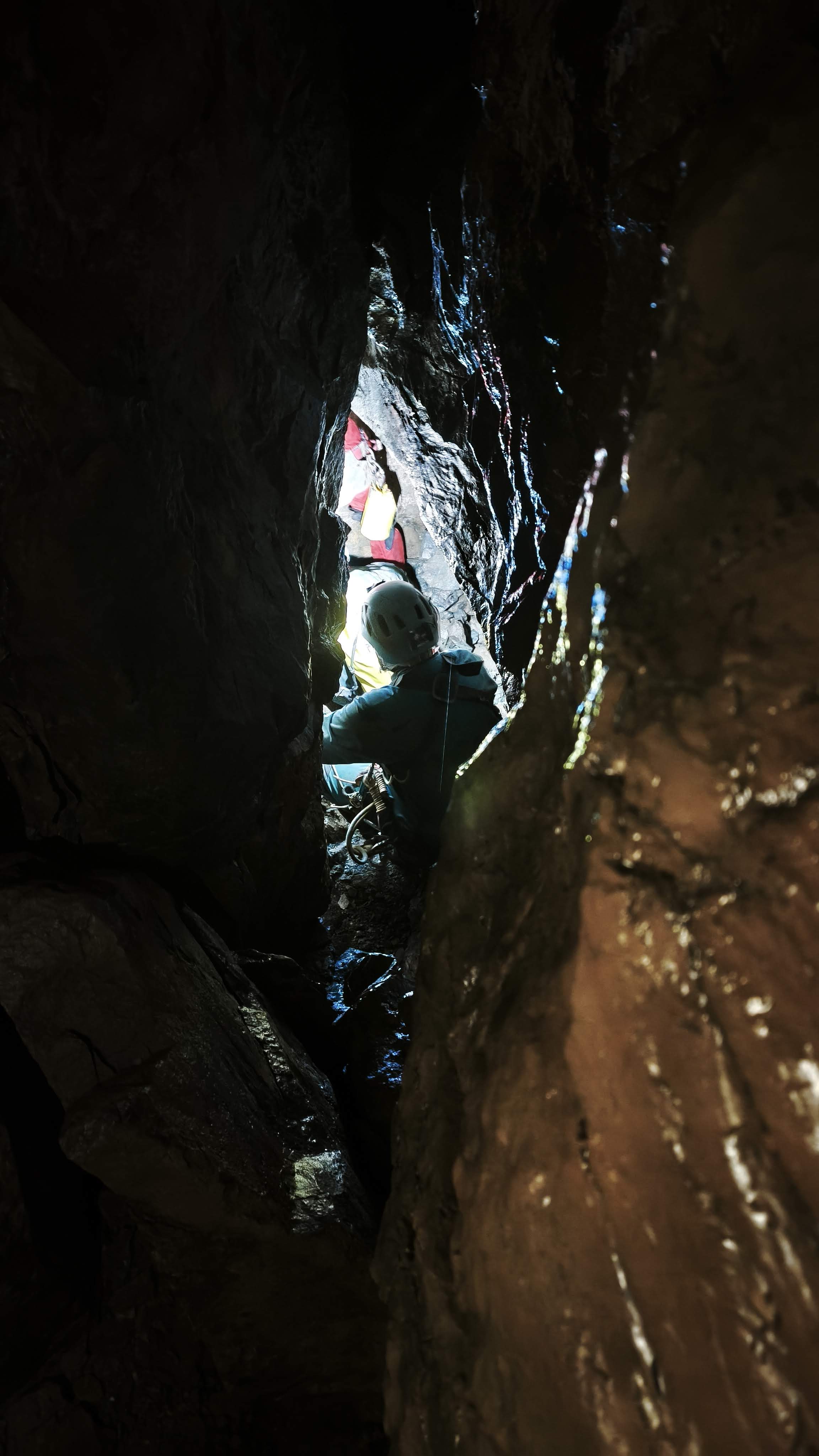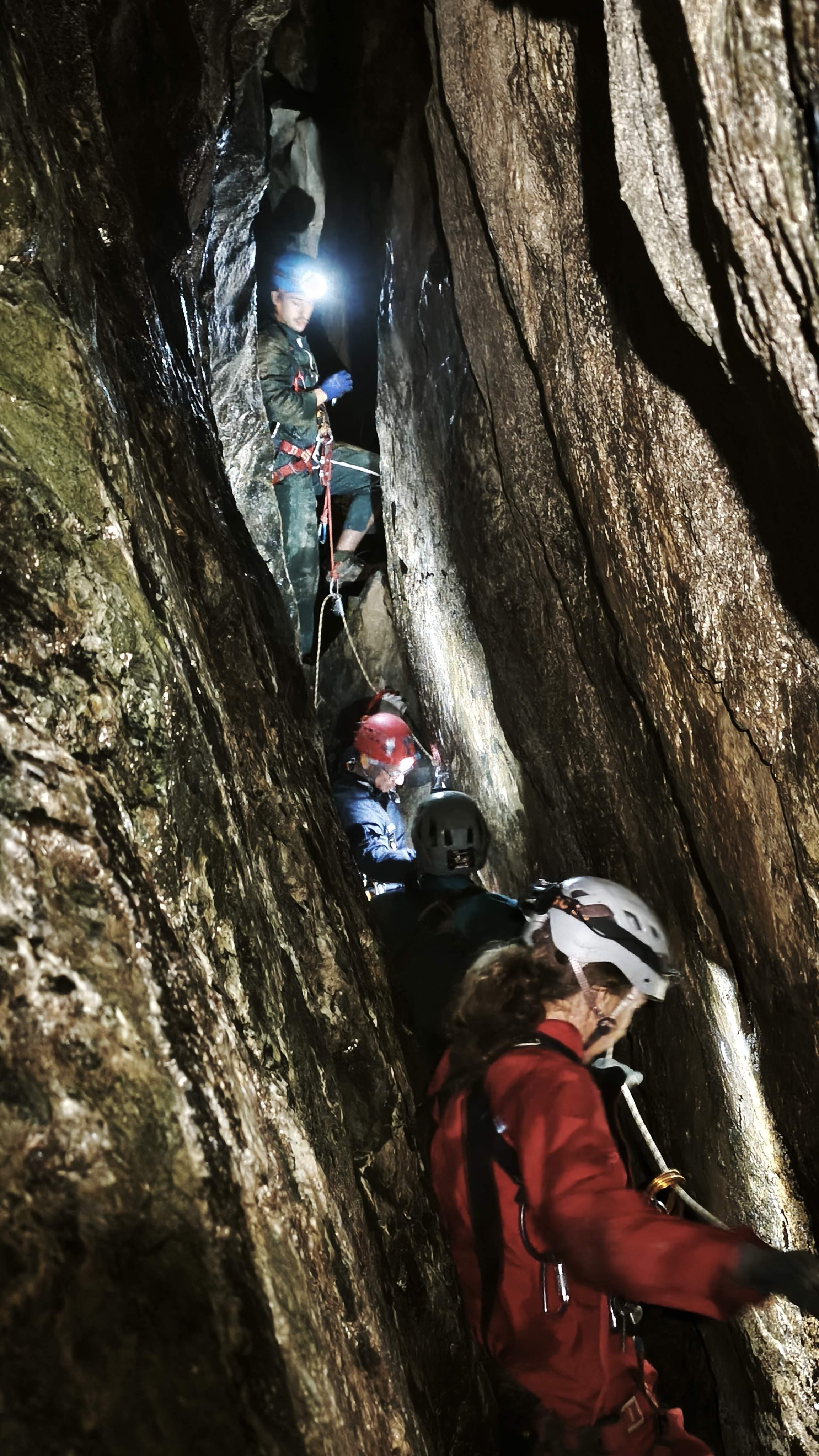 Cathy se charge d’équiper le premier puit, le P5 mais n’avait pas vu un split rajouté pour éviter les frottements; ça sera corrigé ensuite, mettant en évidence une mini main courant permettant d’y accéder.