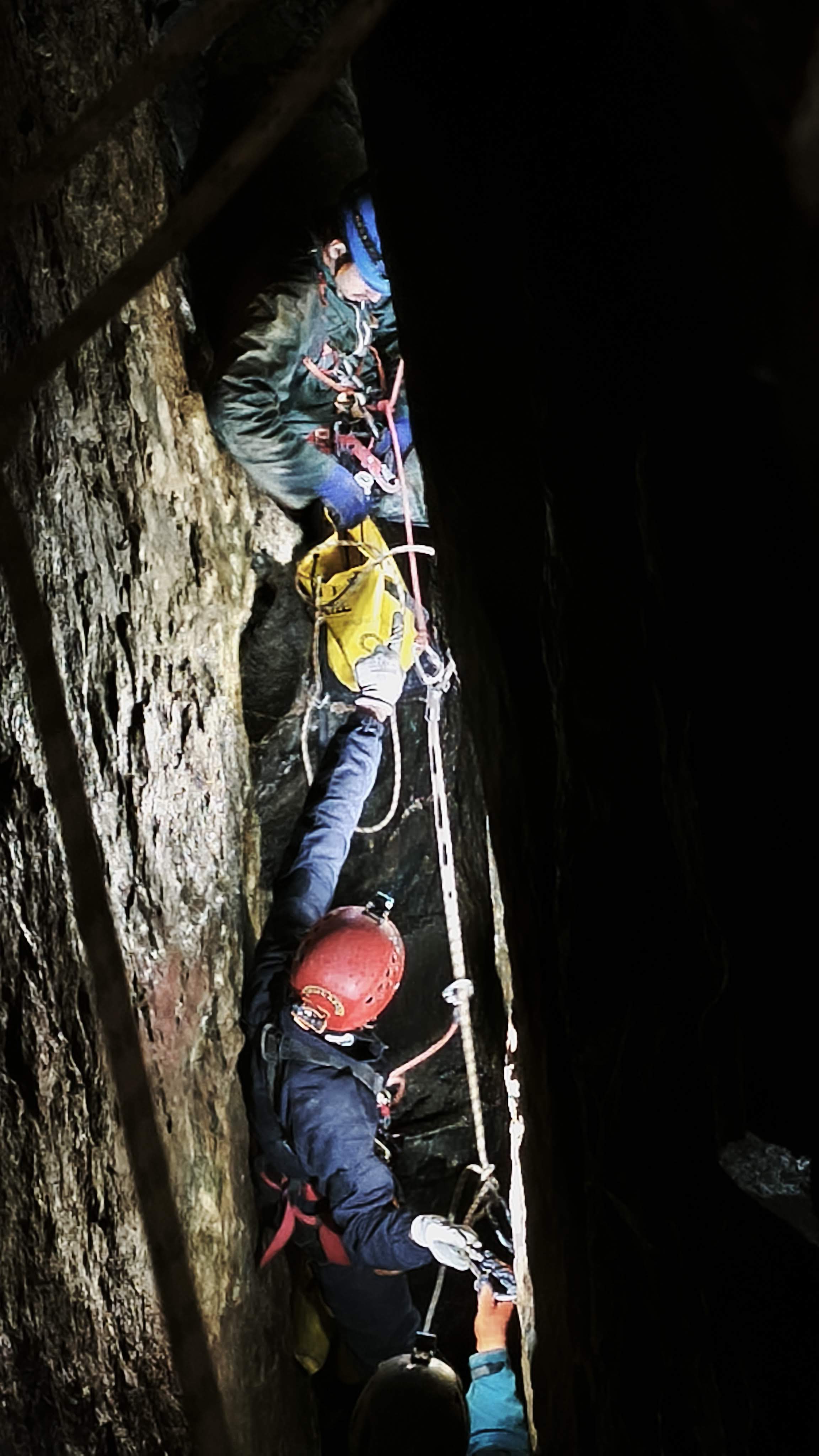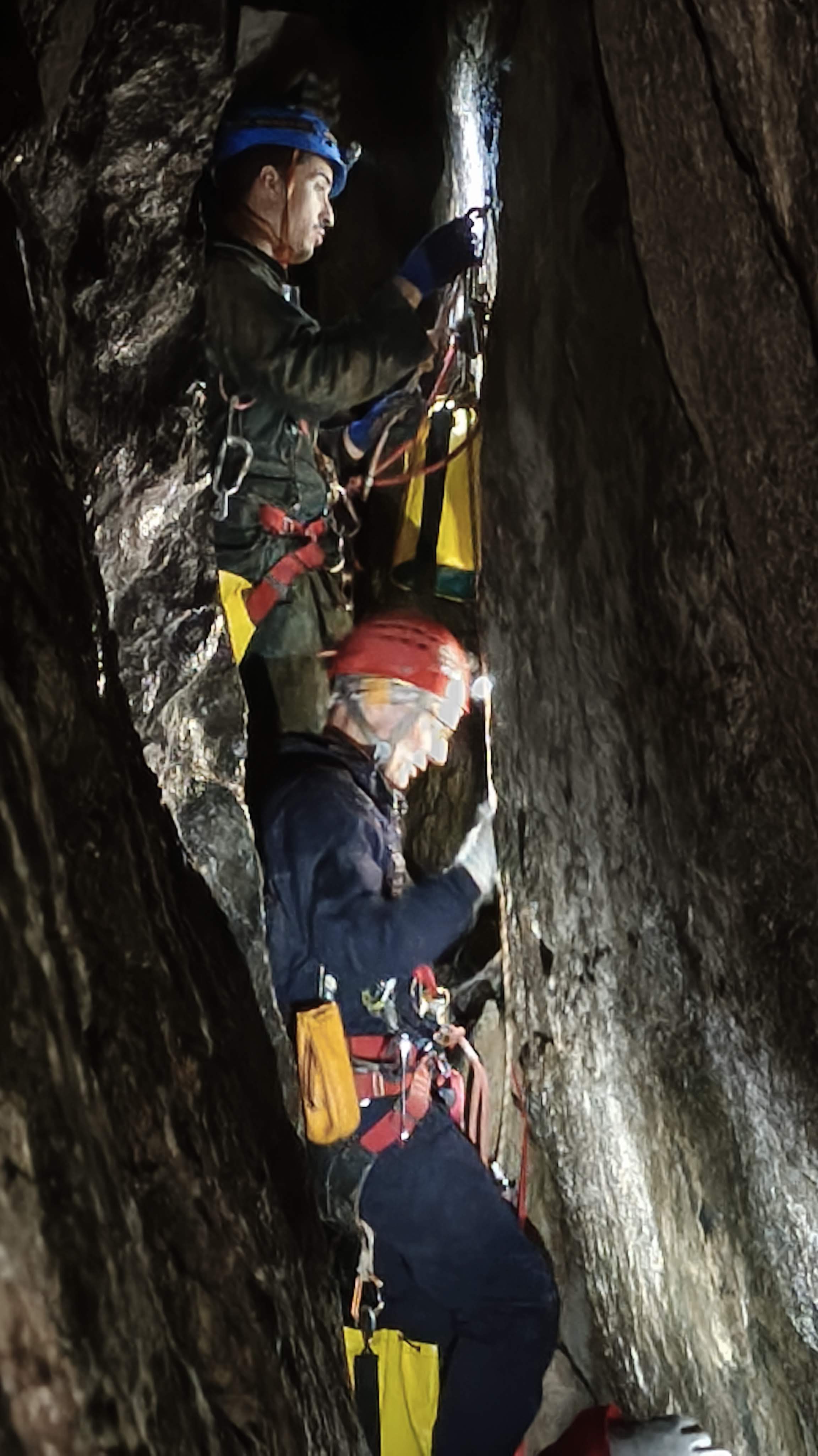 Dans un premier temps et en vue de la future grande tyrolienne qui sera installée dans le cadre d’un entrainement secours, Albert, HP et JCL iront à la recherche des spits perdus. Ils avaient été plantés en 2016 pour tester la dumette https://itopipinnuti.fr/exitp/cr2016.htm#Samedi_16_avril_2016