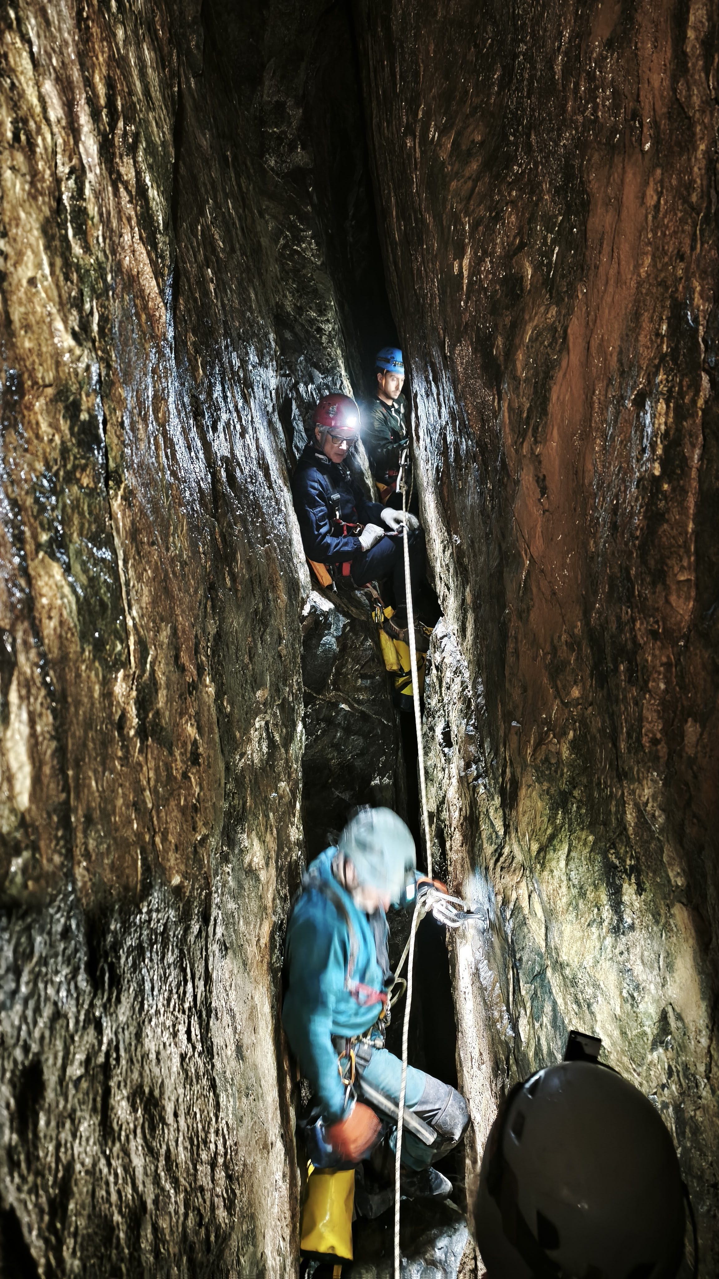 Une fois équipé, je descends et je pars visiter le réseau classique pour compter les chiroptères pendant que les autres entreprennent leur descente, les cordes en fixes sont toujours en bon état, je me suis arrêté après le plan incliné, trouvant que la corde sur la section de montée suivante frottait trop sur la roche pendant que je montais pour voir si tout au fond il y avait des chiros, bon au moins si ils en avaient elles n’ont été pas dérangé et ayant suggéré aux autres de pas aller plus loin car la corde frotte trop.