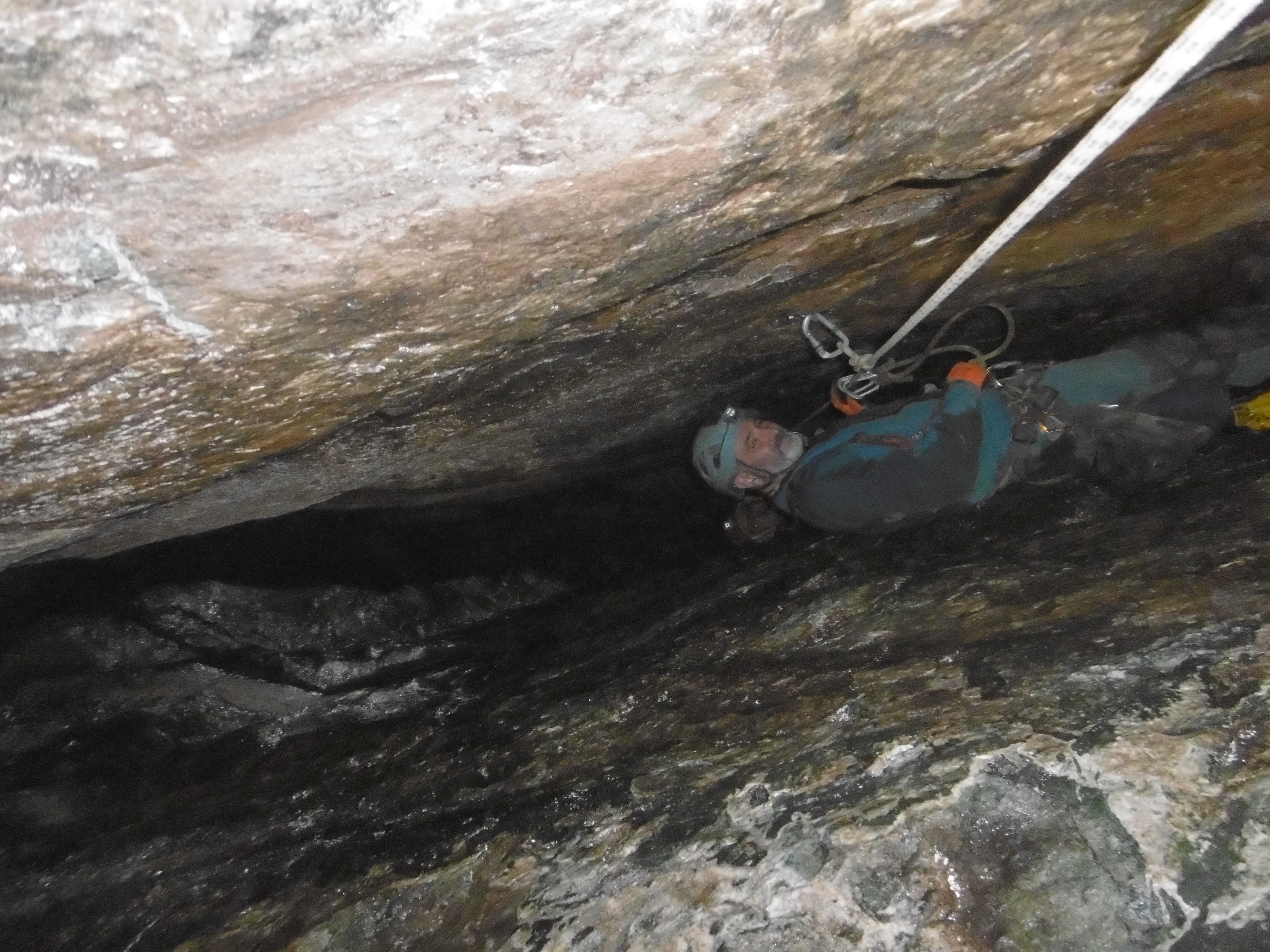 La dernière corde de 20m prévue pour la boite aux lettres est « sacrifiée » pour poursuivre la progression jusqu’à l’entrée de celle-ci, que nous ne pourrons par conséquence, pas faire.