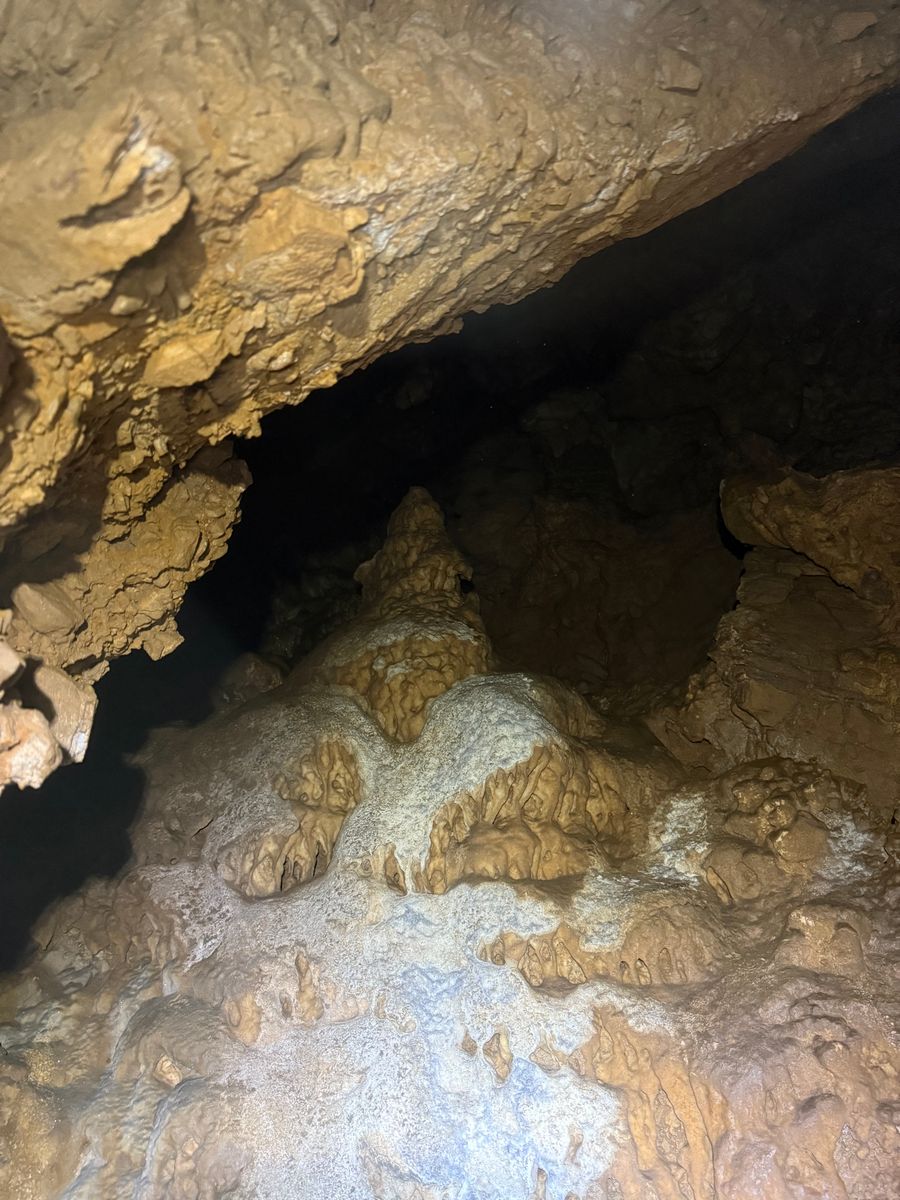 Pendant qu’Albert tente une autre approche le reste de l’équipe s’enfile dans la cavité (on se calme là-aussi…). La cavité ne fait que quelques dizaines de mètres de développement mais on prend notre temps. La petite source intérieure est active, l’eau sourd de la paroi concrétionnée et s’écoule sur les petits gours. Seulement 4 petits rhinos sont comptabilisés et une tarente en brumation est blottie dans une anfractuosité.