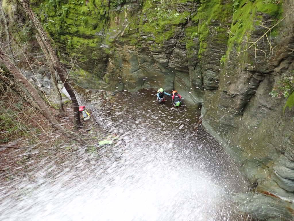 Le canyon démarre à 10 h 15 par un petit toboggan. Certains préfèrent éviter le choc thermique et passent leur tour. Première impression : l’eau n’est pas si glaciale que ça. Pas chaude non plus, mais supportable avec nos combis. Le débit ? Correct, malgré la pluie de la veille…
