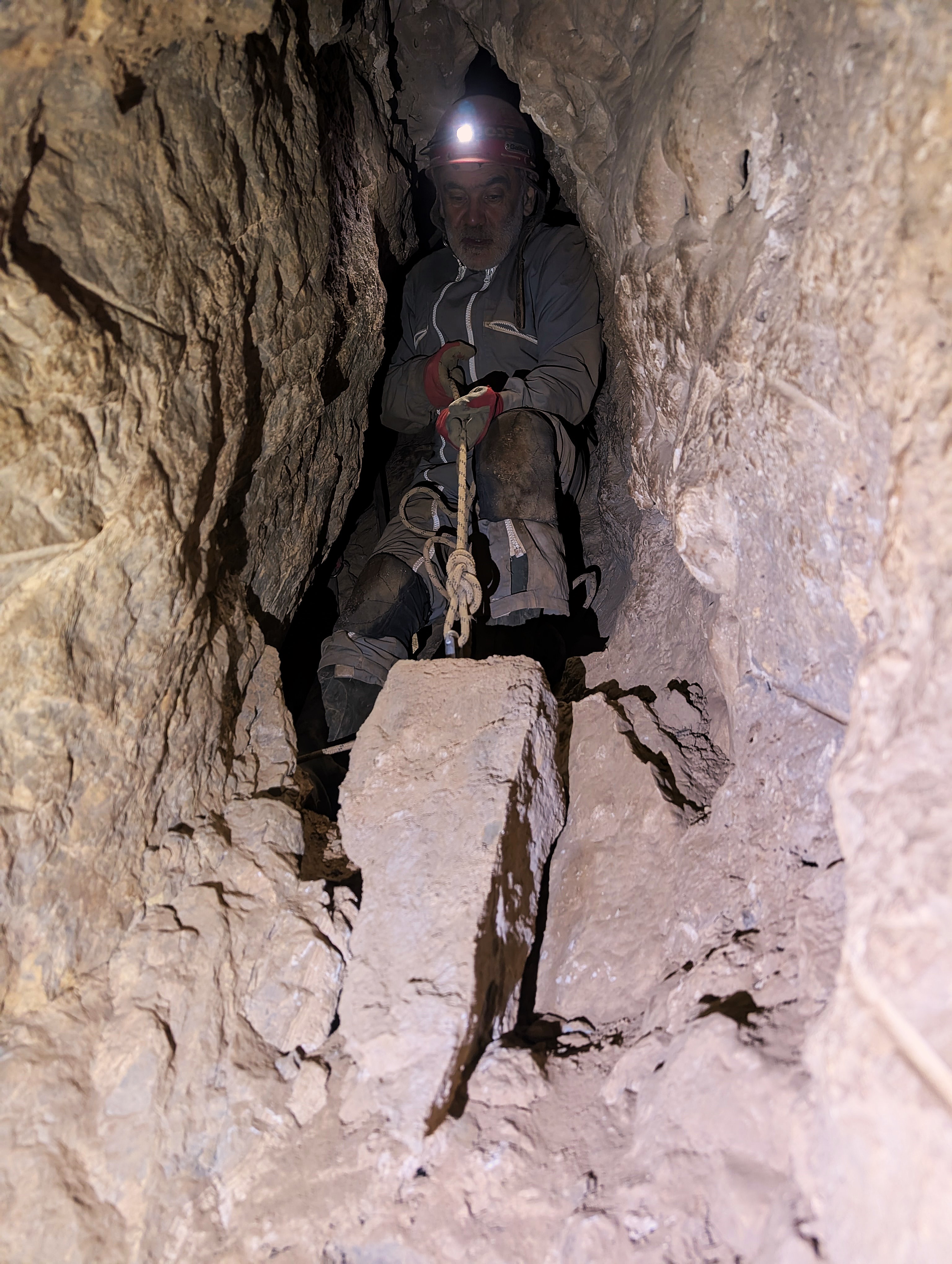 Bref, la faille est plus large. Les cailloux ne descendent plus très loin. On ne peut plus parler de courant d’air mais de vent (Jean-Marie y a attrapé la crève). Constant mais avec des rafales (fort vent d’ouest à l’extérieur).