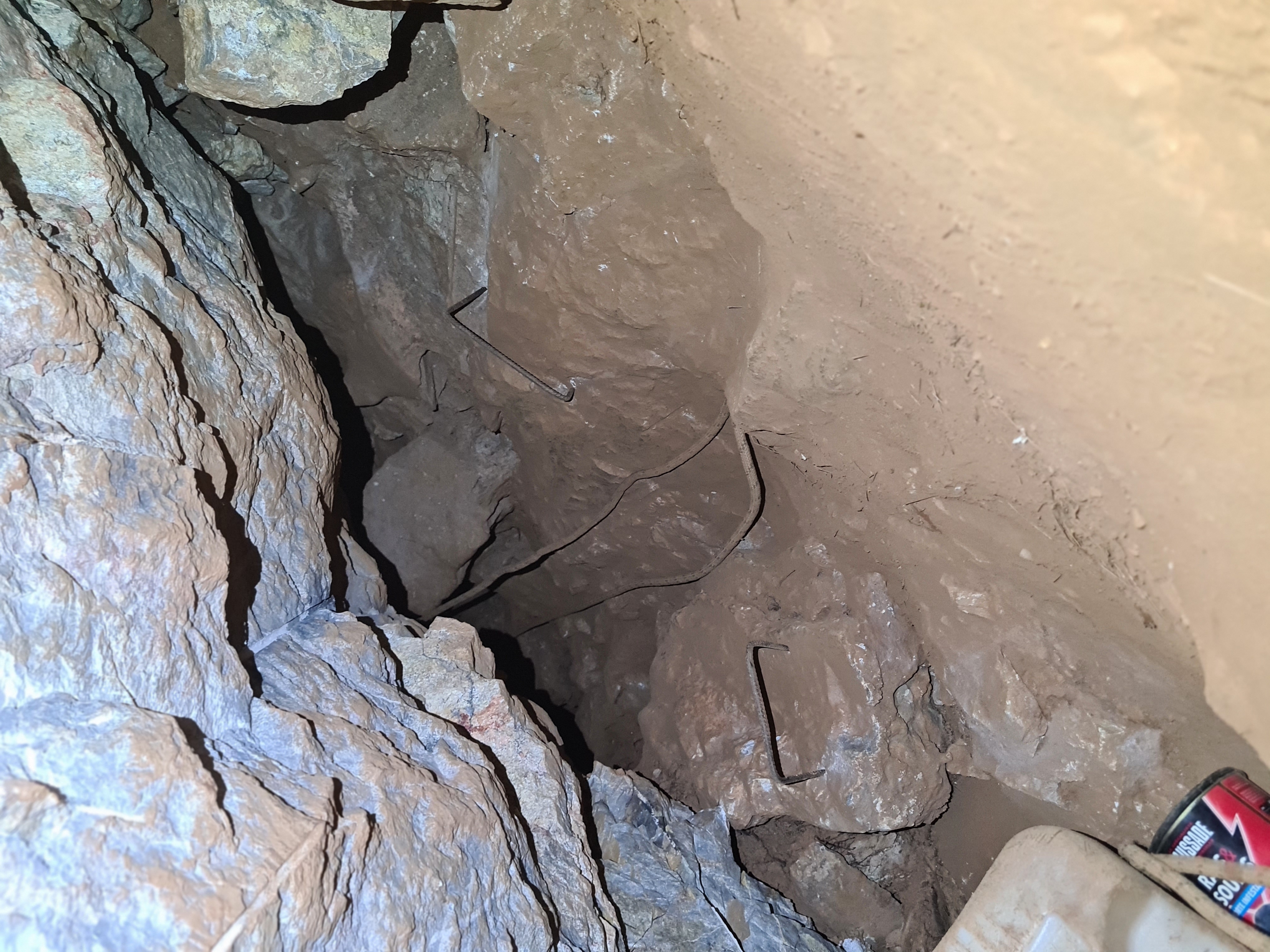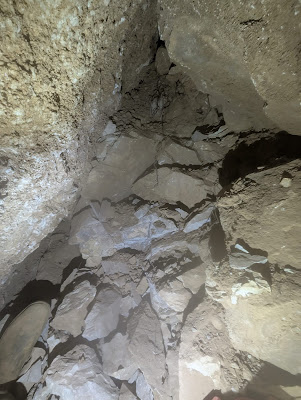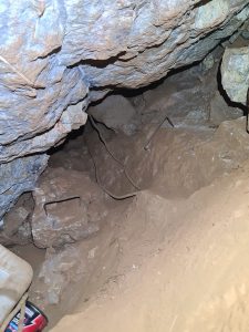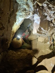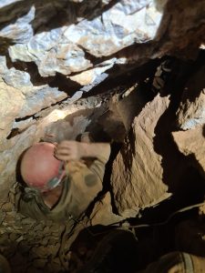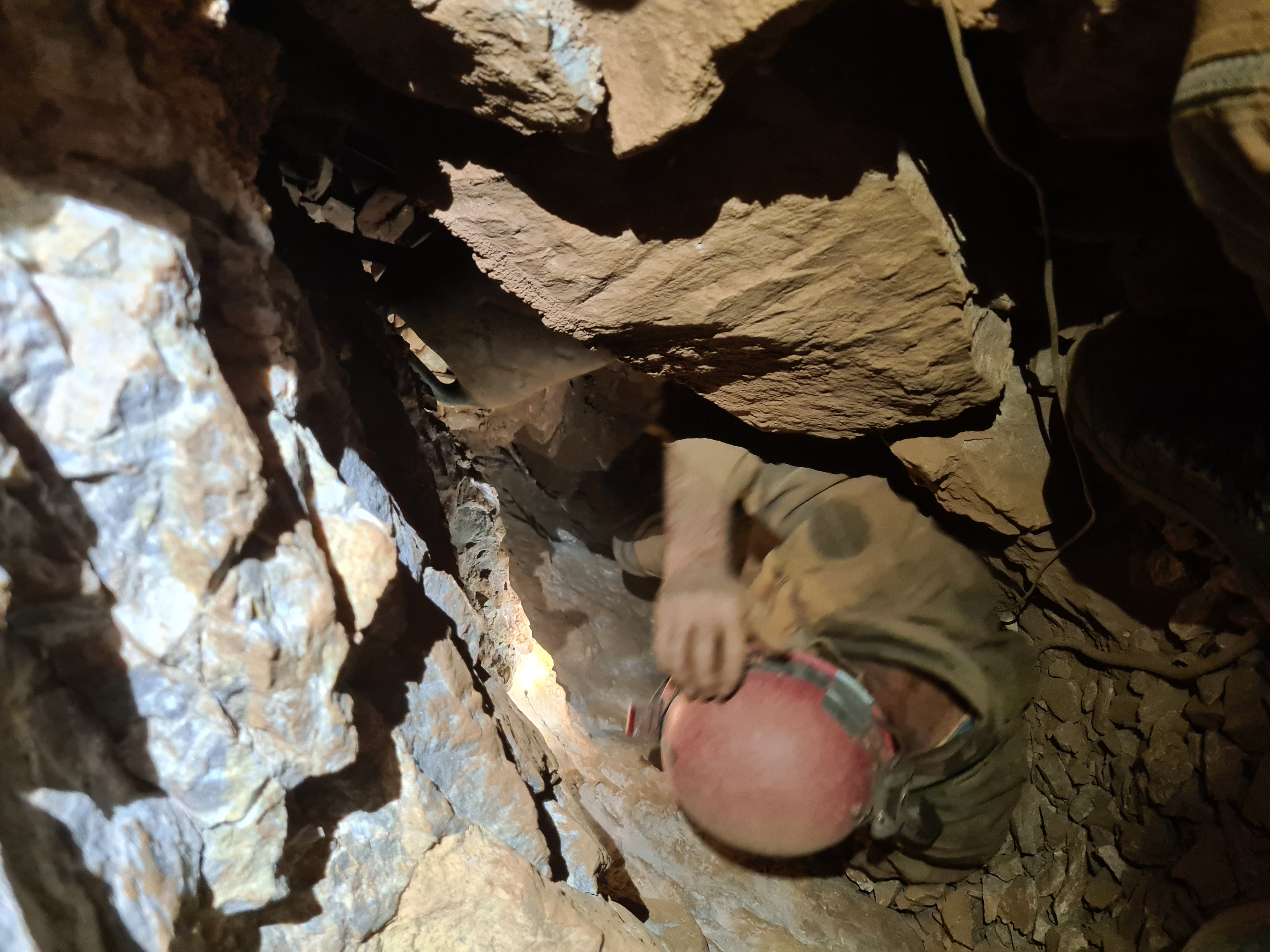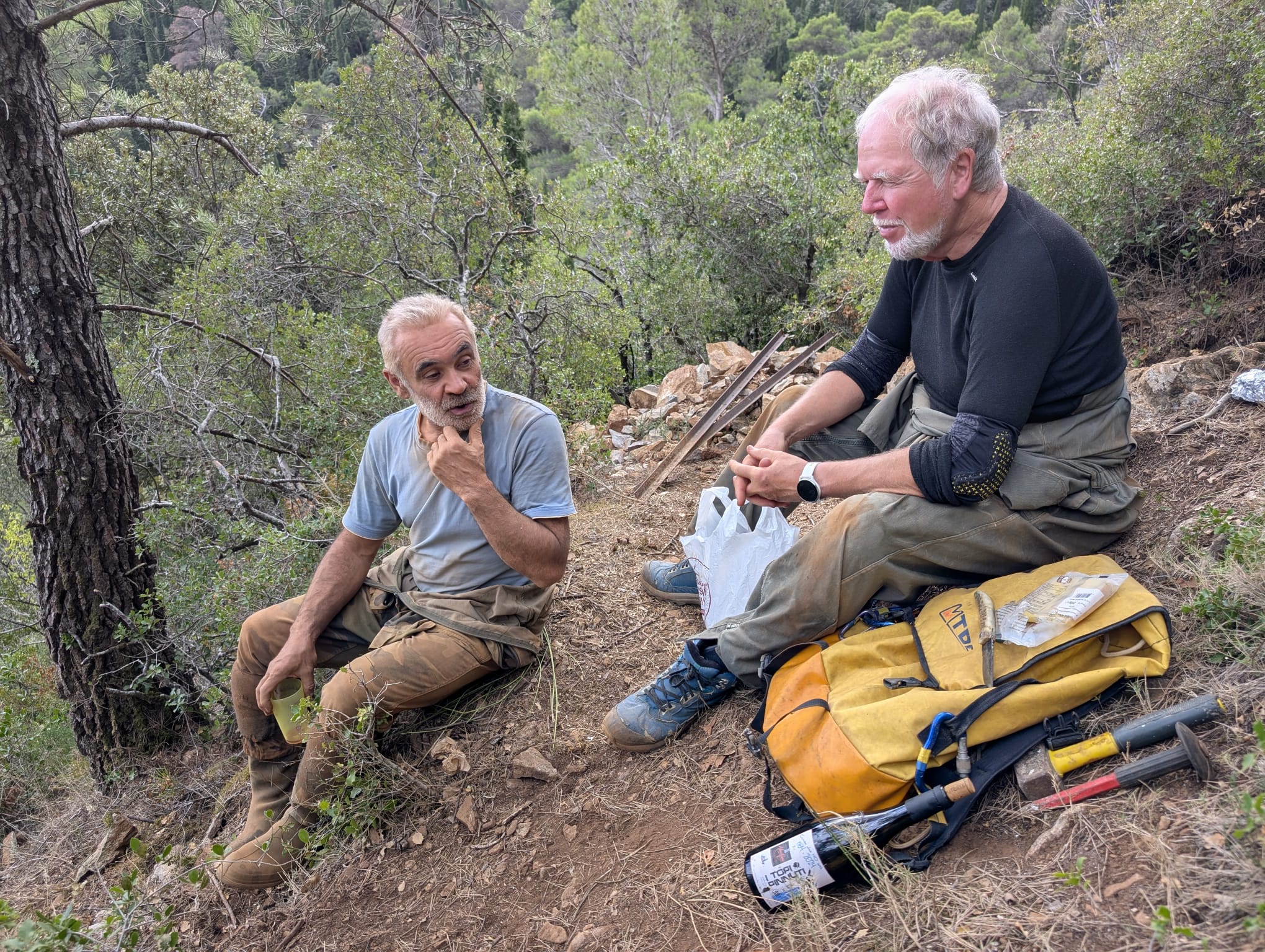 Sur place vers 13 h 30, aucun bruit (mais le fourgon était là ainsi que des kits au bord du trou donc ils creusent). Descente du premier ressaut et là je les entends remonter. Ils ont poursuivi l’extraction des blocs au fond du tunnel. Bien secs, faciles à dégager de leur gangue de poussière. Extraction facile mais stockage limité. Sans montre ni téléphone ils n’avaient aucune idée de l’heure mais leurs estomacs leur rappellent la
