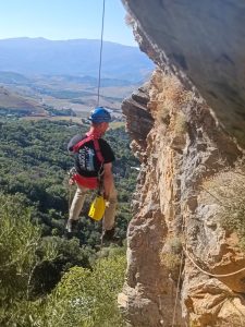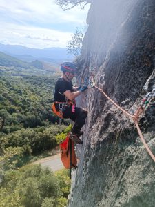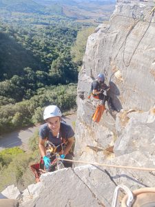 Laureen équipe la voie d’initiation, Christophe la voie du dièdre (déviation de Tozza), enfin Benoit équipe la voie des oliviers, le matin. Franck passe sur toutes les voies afin d’apporter des corrections ou améliorations sur l’équipement en place.