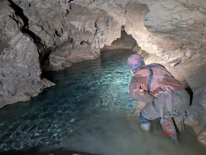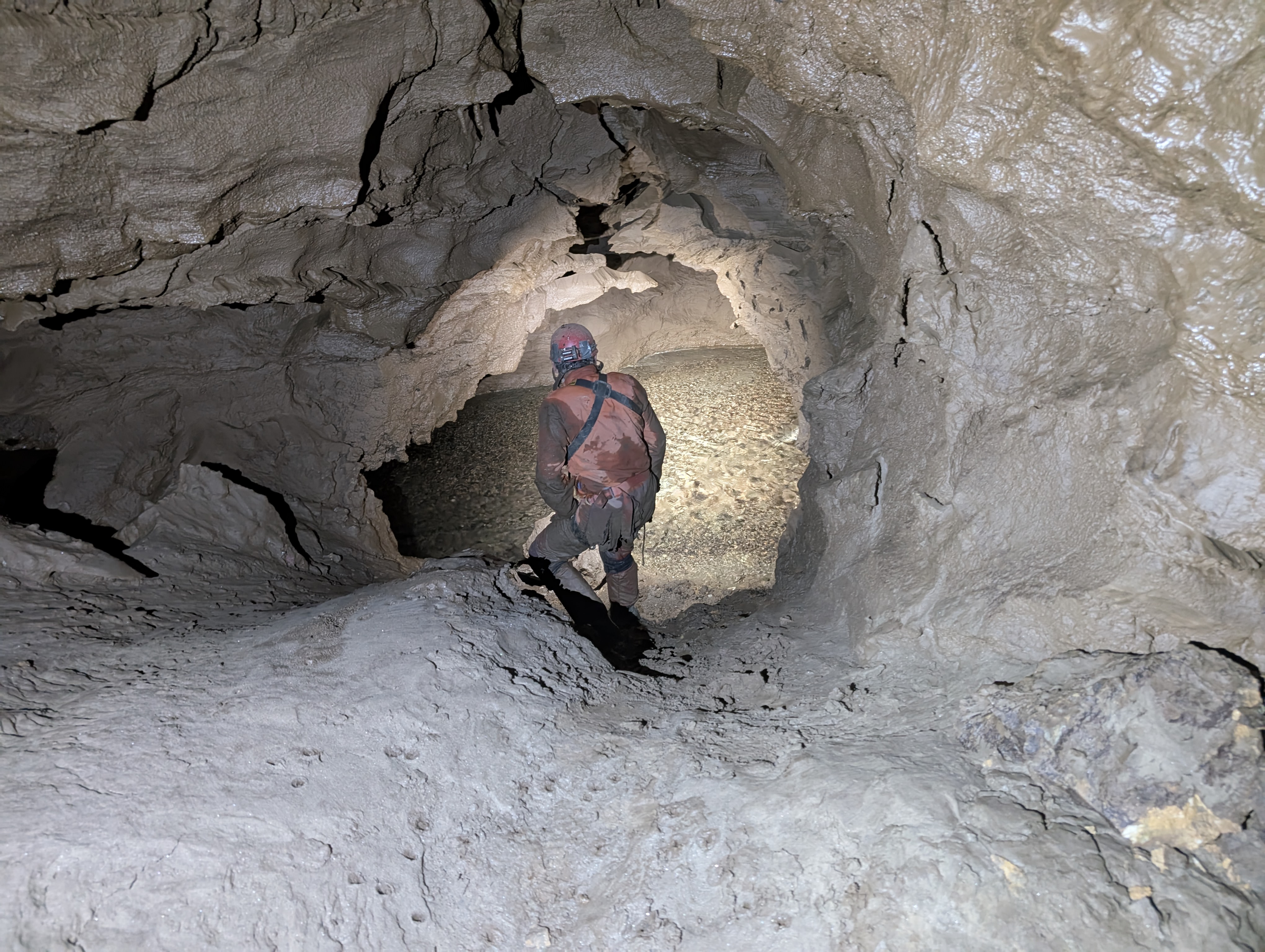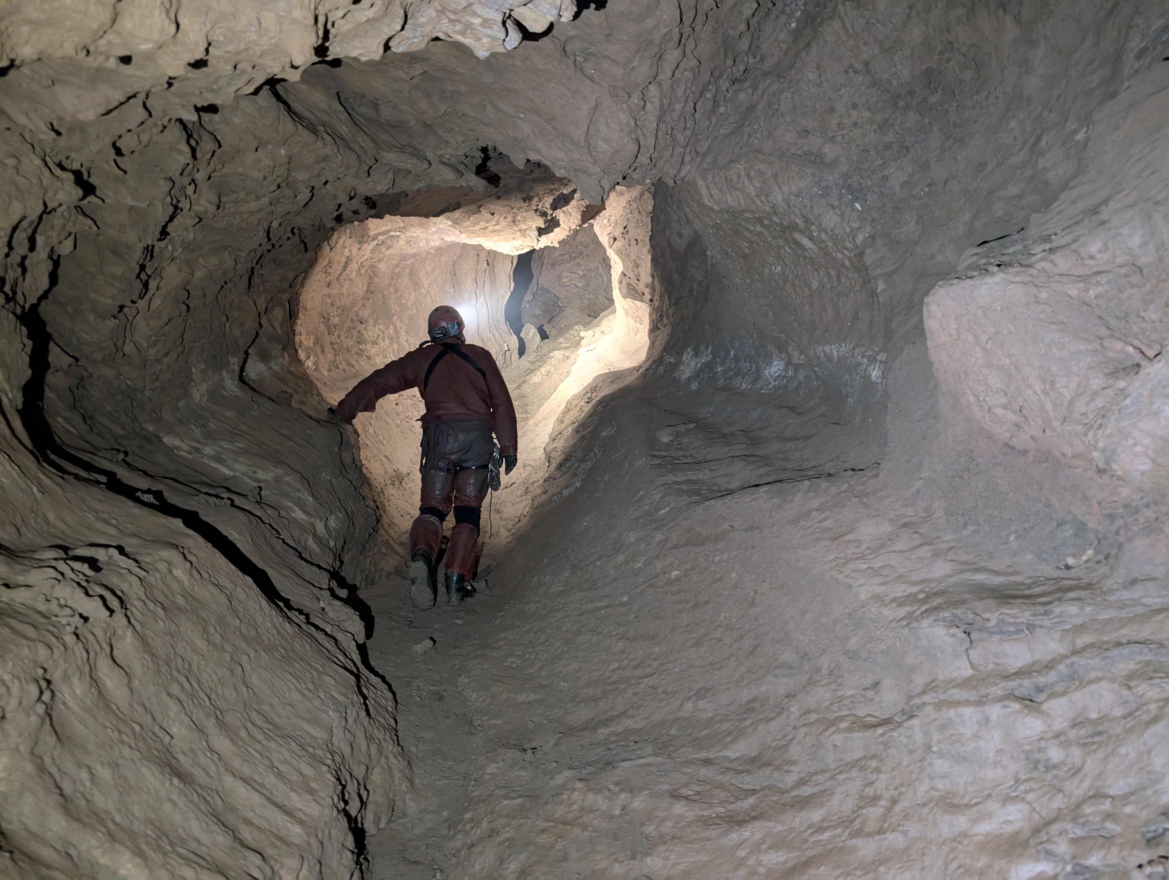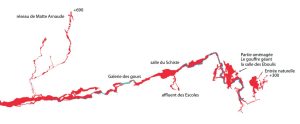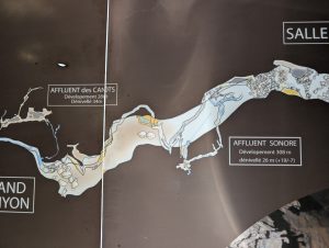 Lors de ma dernière visite de Cabrespine en 2024 – le Réseau Capdeville, situé bien en amont de la zone prévue (après la Galerie des Gours) – j’étais sorti un peu fracassé après six heures de crapahutage. Là le but était d’aller bien plus loin, à gauche hors de la carte ci-dessus, après la Salle des Dômes. Point que Jean-Marie et André atteignaient en marchant à bonne vitesse, en environ trois heures.
