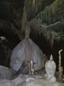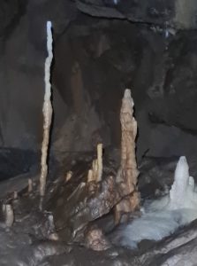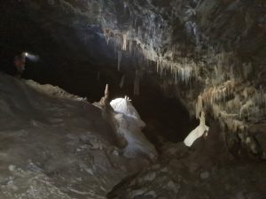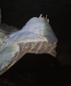 Regroupement à Villeneuve avec l’équipe du Kondalé, café et viennoiseries et direction pour notre trio vers le Gouffre de Cabrespine. Philippe, le directeur et membre du club, nous ouvre les portes à 9 heures. 9 h 30 entrée dans le gouffre, désert pas encore de touristes ! Descente de l’échafaudage puis de l’éboulis, toujours bien glissant. Arrivé au niveau de la rivière, au bout d’une heure, je sens que ce n’est vraiment pas la grande forme, jambes un peu molles, instabilité sur les blocs… Mais les copains sont déjà devant à préparer le canoé pour traverser la partie aquatique de la rivière. Et une fois au débarcadère, pas question de faire demi-tour !