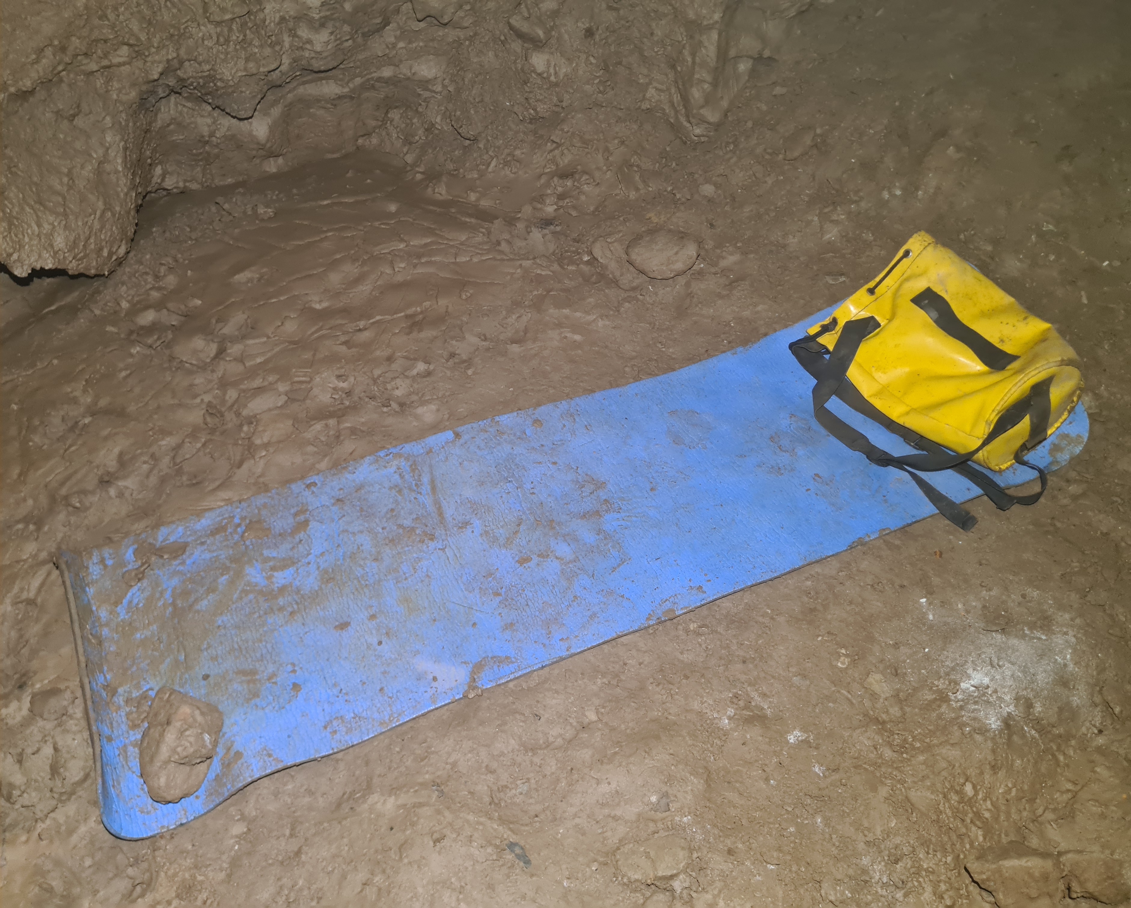 Le calcul est vite fait, aller et retour cela ferait au moins deux heures de crapahut. Le retour risque d’être extrêmement galère sans parler du risque de glissades, etc. La décision est prise : pas question de faire demi-tour, seul c’est trop paumatoire et risqué, sans compter le lac à traverser, je vais les attendre ! En fait on s’est arrêté juste avant les Dômes au niveau d’une alcôve sèche, au sol argileux qui servait de bivouac pour les grandes explos. Et il reste encore deux karrimat°, et suprême luxe, Jean-Marie sort de son kit un poncho, une petite – toute petite – bougie et un briquet. J’ai des provisions, de l’eau, des sous-vêtements épais, mais humides -, je devrais tenir. Combien de temps, au minimum deux heures d’après les copains. Il est 12 h 20.