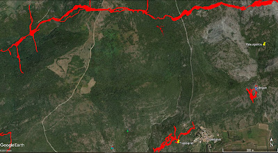 D’après le report topo le réseau du Kondalé est à 55 mètres au sud de la rivière et quelques dizaines de mètres au-dessus. Ci-dessus, le Kondalé est le petit gribouillis au milieu en haut, à gauche de la piste. Plus précisément entre l’éboulis sud des Fistuleuses et l’Affluent des Canots. Plus précisément vers l’Affluent Sonore. Jean-Marie, qui connait plutôt bien la cavité et avait déjà eu l’occasion de tenter des désobs dans cette zone, ne connait pas cet Affluent Sonore.