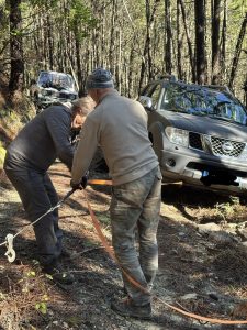 Le rendez vous est prévu à 07h00 au pn°4 à Biguglia. Adriana et Antonio avaient anticipé et sont montés la veille pour chauffer la Casetta. Pour l’occasion mon PAJERO reprend du service après une réparation rapide le vendredi après-midi, certes ce n’est pas esthétique mais cette dernière est efficace (voir CR JNSC du 05 octobre 2025). Après une traditionnelle pause à Aléria, nous arpentons la piste qui est effectivement bien dégradé depuis notre dernier passage. Une douzaine d’arbre entravent le chemin, Anto joue de la tronçonneuse électrique. Nous arrivons à hauteur du 4*4. Il faudra pas moins de 02h30 pour dégager ce dernier a l’aide de câbles aciers, deux tireforts et beaucoup de réflexion. Au cour du sauvetage nous somme rejoins par Adriana et Antonio. L’apéro, bien mérité, ainsi qu’un petit graillou sont dégustés à la Casetta. Nous effectuons un petit détour vers le captage pour constater les dégâts: de nombreux arbres se sont arrachés et tombés autour du captage. Lors de notre visite il faudra prendre la tronçonneuse. Le retour ne posera aucun problème aux deux véhicules tout-terrains.