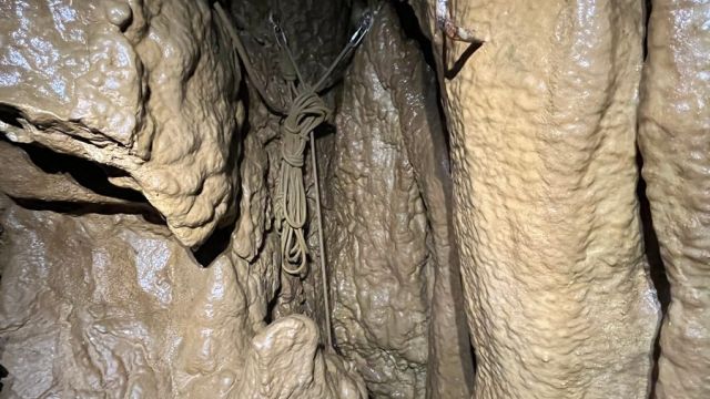 Je commence à équiper la tête de puits, j’entame la descente, installe la plaquette pour la première dev et puis je poursuis à la recherche de ce fameux autre spit pour la seconde dev, chose qu’on avait pas retrouvée en 2022. C’est sans compter sur les indications de JC qui me dit plus haut « Non descend encore !! » et de mémoire je me rappelle d’une photo où le spit de la dev était sur une roche humide, mes recherches se sont donc concentrées sur cet indice, bingo je trouve le spit de la seconde dev, que je mets en place.