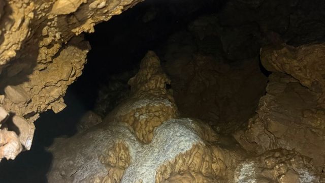 La 3ème se situe à quelques centaines de mètres. Une entrée basse suivie par une longue flaque d’eau nécessitant les bottes. C’est la plus longue des 3, une cinquantaine de mètres agrémentée là-aussi de concrétions blanches. Un petit rhino y est observé.